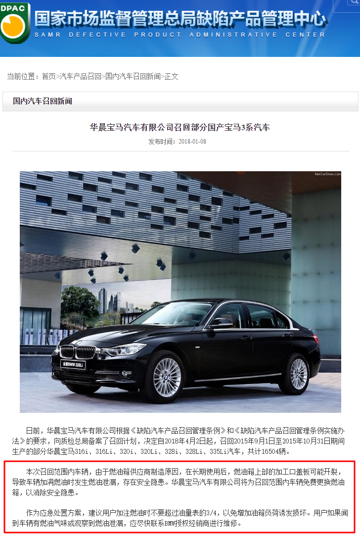實際上,早在2018年1月,寶馬3系汽車的生產(chǎn)商華晨寶馬汽車有限公司就宣布召回2015年9月1日至2015年10月31日期間生產(chǎn)的部分華晨寶馬316i、316Li、320i、320Li、328i、328Li、335Li汽車,共計16504輛。