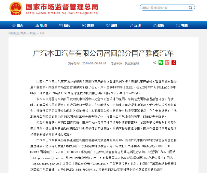 8月8日下午,廣汽本田宣布自2019年8月30日起,召回2017年7月25日至2019年8月7日期間生產(chǎn)的裝備1.5T渦輪增壓發(fā)動機的部分國產(chǎn)雅閣汽車,共計222674輛,其中就包括本次“失速門”的2018款雅閣汽車。