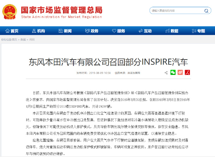 8月9日上午,東風本田也宣布召回本次“失速門”涉及的2019款INSPIRE汽車,召回原因與廣汽本田雅閣相似,都是在大雨等高溫高濕環(huán)境下行駛時出現(xiàn)發(fā)動機缺火,從而導致加速受限問題。