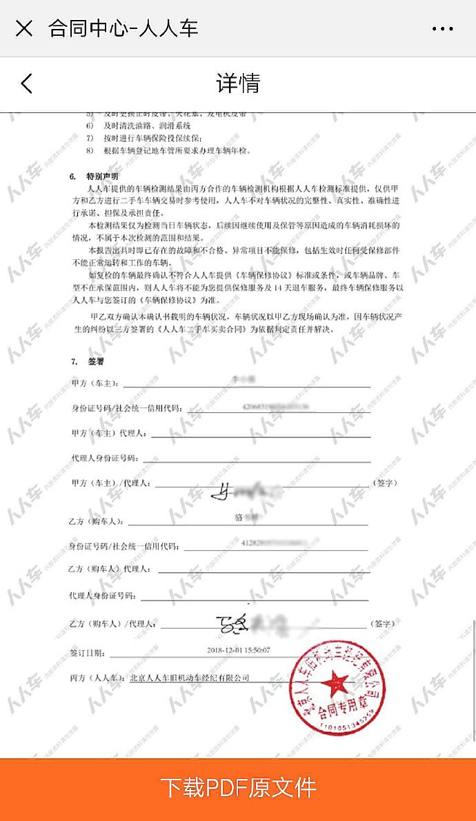 本刊查看人人車12月1日出具的《復(fù)檢確認(rèn)書》顯示除“左右燈更換、車身線舒束更換,前杠劃痕,右前門凹陷,后杠刮痕”外,其余正常,特殊事故排查中,無“水泡”現(xiàn)象。