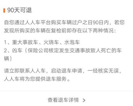 本刊發(fā)現(xiàn),在人人車合同上明確提示“自通過人人車平臺購買車輛過戶之日90日內(nèi),發(fā)現(xiàn)所購的車輛在復(fù)檢前存在水泡車情況,一經(jīng)核實將在90天內(nèi)提供退車服務(wù)”。