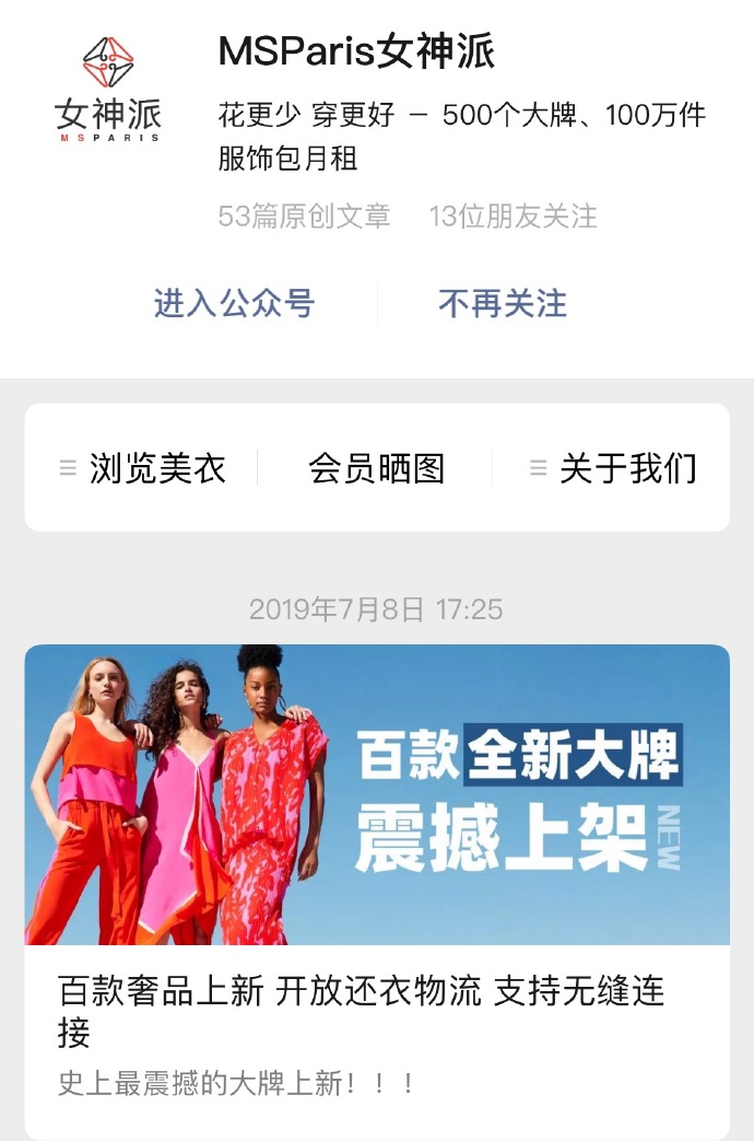 共享衣櫥即共享租衣,衣物由平臺(tái)提供,購(gòu)買會(huì)員的用戶通過(guò)收寄快遞的方式享受訂閱式租衣,女神派創(chuàng)立于2014年,于2015年3月上線。