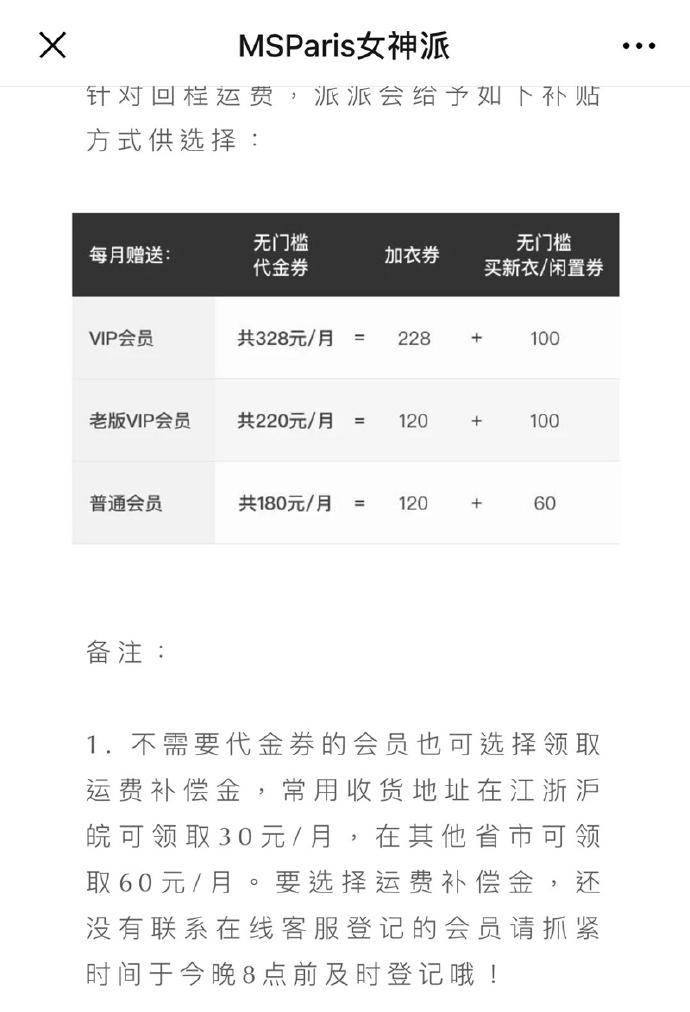 同時(shí),女神派給出兩種補(bǔ)償方案供老用戶挑選,一種是根據(jù)會(huì)員的性質(zhì)補(bǔ)償最高328元的無(wú)門檻代金券,即加衣券或新衣券、閑置券;另一種是根據(jù)不同地區(qū)補(bǔ)貼運(yùn)費(fèi),江浙滬皖補(bǔ)貼30元/月,其余60元/月。