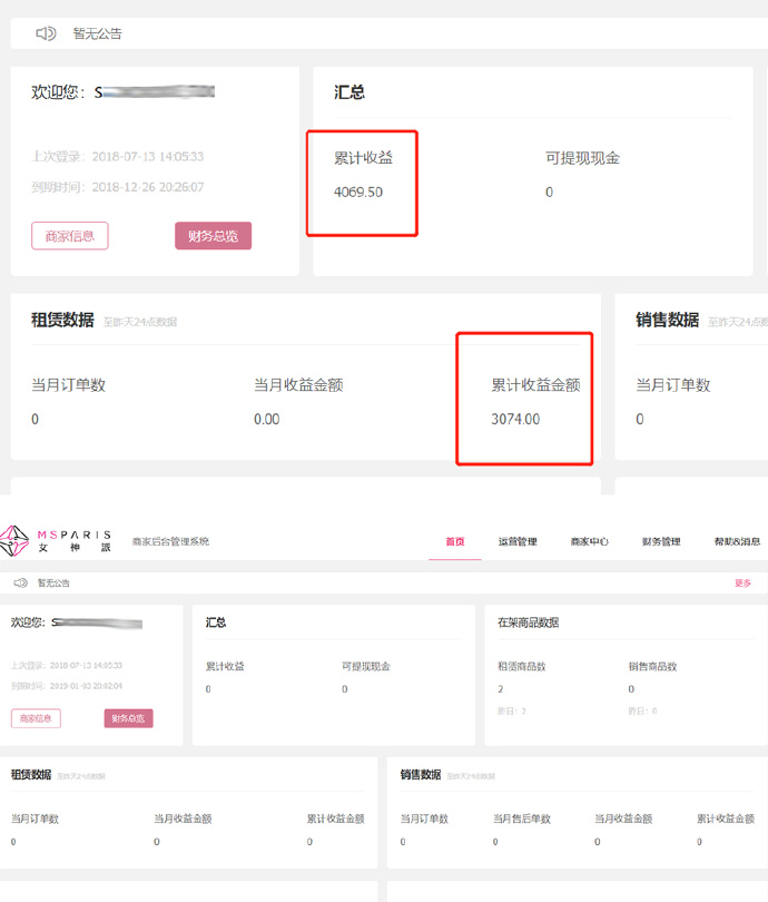 該供貨商提供了兩張后臺(tái)截圖,一張有“累計(jì)收益”數(shù)據(jù)為4069.5元,另一張卻顯示0元收益,供貨商告訴本刊,“當(dāng)時(shí)女神派解釋因?yàn)楹笈_(tái)數(shù)據(jù)亂了,后來(lái)導(dǎo)出了一份Excel數(shù)據(jù)表,但那表格與我在后臺(tái)看的數(shù)據(jù)不符,無(wú)奈后臺(tái)數(shù)據(jù)已經(jīng)清零,無(wú)法再核對(duì)了?!?/p>