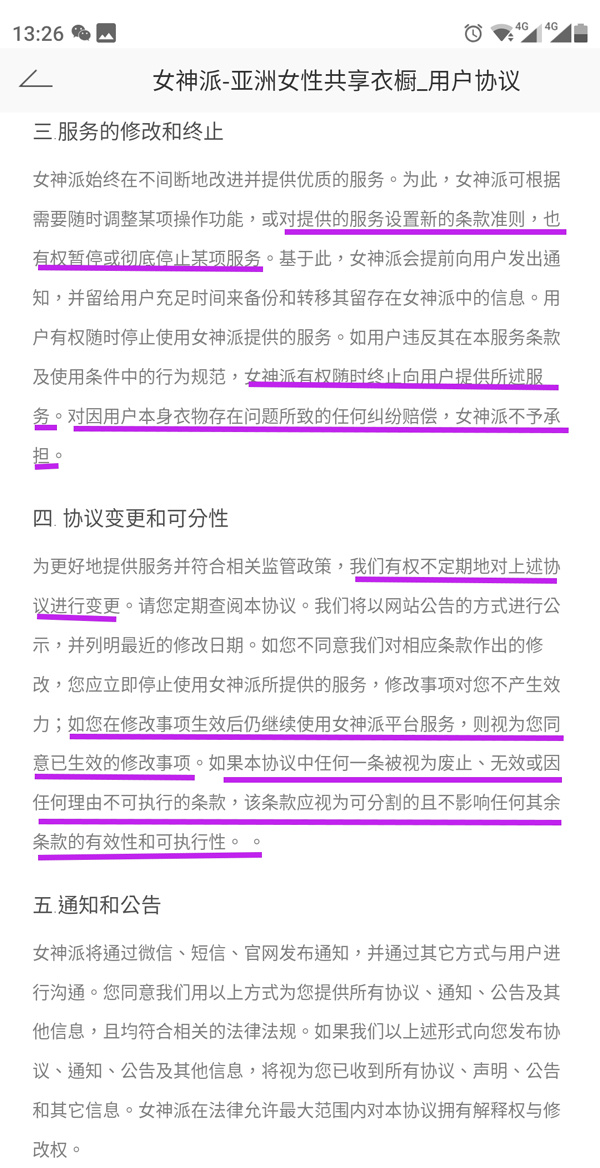 在女神派的用戶協(xié)議中,本刊查看到有如下說(shuō)明,“可根據(jù)需要隨時(shí)調(diào)整某項(xiàng)操作功能,或?qū)μ峁┑姆?wù)設(shè)置新的條款準(zhǔn)則,也有權(quán)暫停或徹底停止某項(xiàng)服務(wù)”“有權(quán)不定期對(duì)上述協(xié)議進(jìn)行變更”……