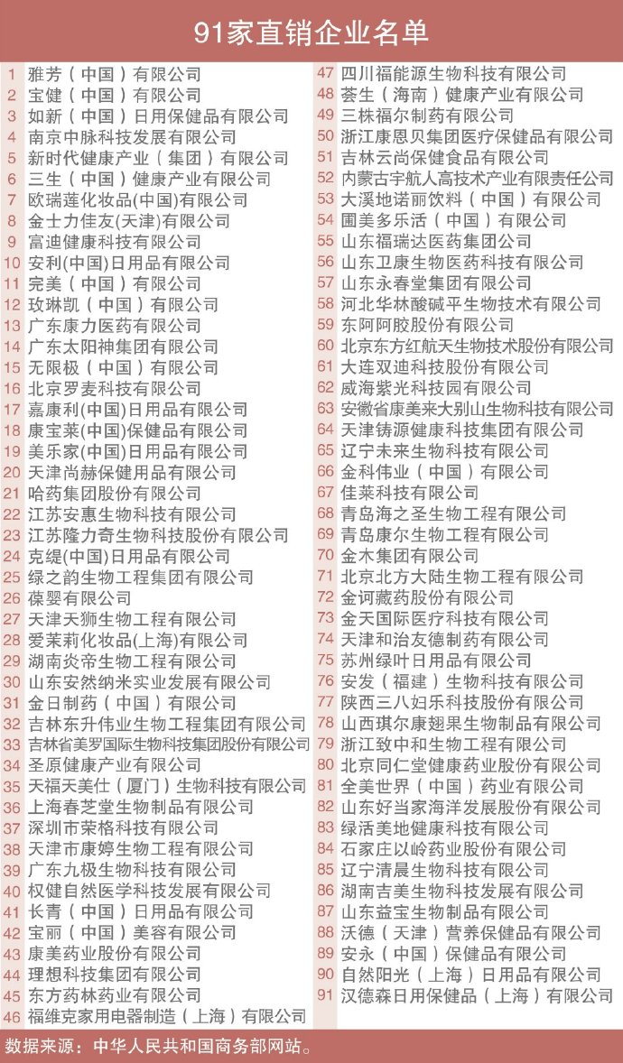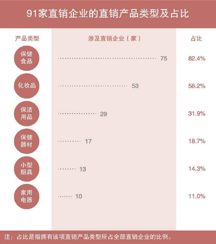 據(jù)中華人民共和國商務(wù)部官網(wǎng)的信息顯示,在中國合法注冊的直銷企業(yè)有91家,直銷產(chǎn)品的類型涉及保健食品、化妝品、保健器材、保潔用品、家用電器、小型器具等多個(gè)領(lǐng)域。