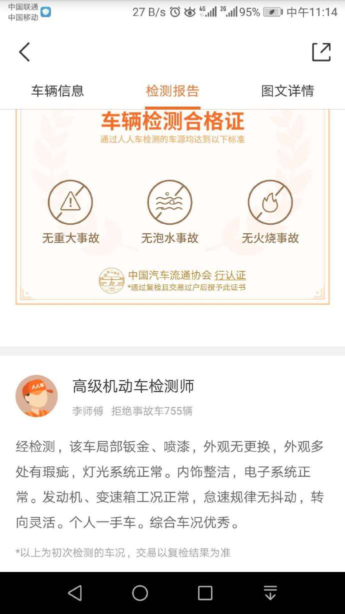 根據(jù)投訴人提供的信息,這輛東南V5二手車在人人車平臺的車輛檢測報告顯示,車輛檢測合格證,通過人人車檢測的車源均達到以下標準:無重大事故、無泡水事故、無火燒事故。