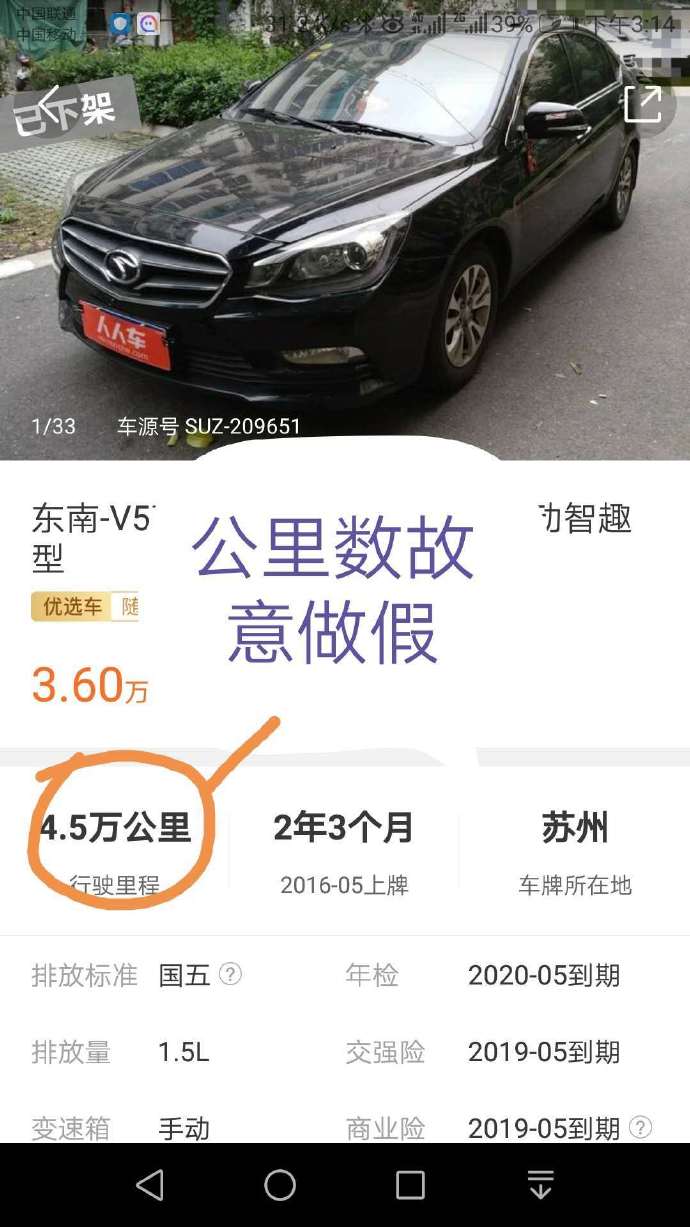 投訴人于2018年7月在人人車平臺上購入標價3.6萬元的一輛原蘇州牌照的東南-V5菱致(2015款 plus 1.5L 手動智趣型汽車)。