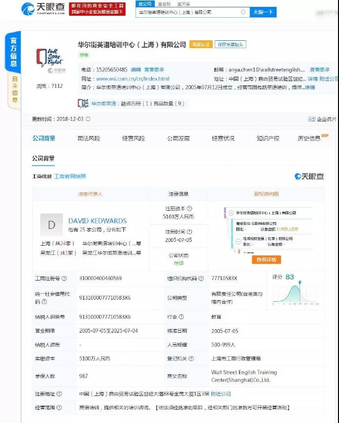 華爾街英語自己在官網(wǎng)寫出來的企業(yè)主體是華爾街英語培訓(xùn)中心(上海)有限公司,天眼查一下,這是一家不折不扣的合資企業(yè),法人代表是個老外。很符合國際知名教育品牌的設(shè)定。