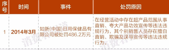 2019年2月,《消費者報道》跟進直銷調(diào)查時發(fā)現(xiàn),如新因虛假宣傳、夸大產(chǎn)品功效等違法行為于2014年3月被工商沒收違法銷售收入448.2萬元,處以罰款38萬元。