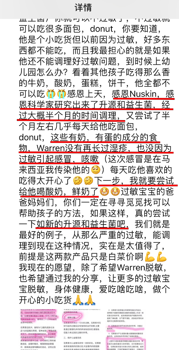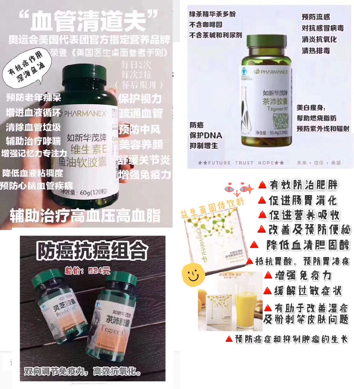 在如新事業(yè)伙伴的朋友圈可看到部分產(chǎn)品有防癌抗癌等暗示治療效果的宣傳:如新的牙膏與常見牙膏不同,不含致癌的膠質(zhì)粘合劑,配圖視頻為將如新及其它品牌的牙膏分別涂抹在手背上,靜待如新牙膏“被吸收”以證實它不含“致癌”膠質(zhì)粘合劑;如新的益生菌固體飲料可預(yù)防癌癥和抑制腫瘤的生長等;如新的維生素可以清除血管垃圾、預(yù)防中風等;茶沛膠囊能防癌等;如新的益生菌可以調(diào)節(jié)寶寶腸道、防過敏等。