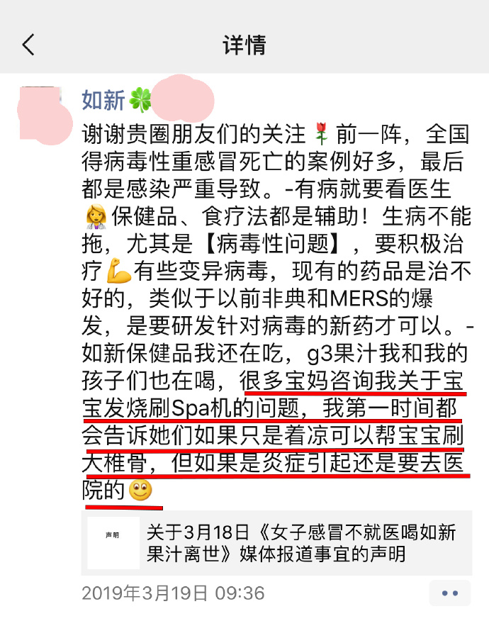 林麗也曾堅持在小孩子發(fā)燒時用如新spa機疏通經(jīng)絡(luò),認為無需吃藥,3月21日,《消費者報道》聯(lián)系上蘇偉,他告訴本刊,spa機的概念類似于中醫(yī)刮痧術(shù)。本刊調(diào)查發(fā)現(xiàn),如新的事業(yè)伙伴確在力推spa機,直至上述事件發(fā)生后,一名如新事業(yè)伙伴在朋友圈發(fā)文稱“很多寶媽咨詢我關(guān)于寶寶發(fā)燒刷spa機的問題,我第一時間都告訴她們?nèi)绻皇侵鴽隹梢詭蛯殞毸⒋笞倒牵绻茄装Y引起還是要去醫(yī)院。”由此亦可看處,如新自上而下確有宣傳spa機可治發(fā)燒的事實。