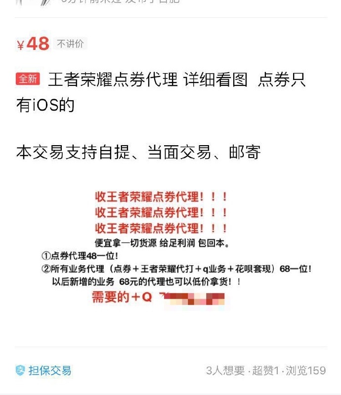 以王者榮耀為例,黑客使用消費(fèi)者的?Apple ID 在游戲內(nèi)購買大量點(diǎn)券(人民幣1塊錢購10點(diǎn)券),則可用點(diǎn)券在游戲內(nèi)兌換皮膚、積分等虛擬物品。一位資深游戲玩家大波告訴本刊,如果想要便宜購買游戲裝備,不少人會(huì)通過淘寶、天貓和交易貓等平臺(tái),以及私下互加好友通過微信、支付寶進(jìn)行交易。比如1688點(diǎn)券的王者榮耀皮膚,淘寶上65折,110元左右能買到,私底交易則是自行談價(jià)?!氨阋说L(fēng)險(xiǎn)大,私下交易并不安全。賣家都會(huì)說自己來自正規(guī)渠道,可誰知道呢?”