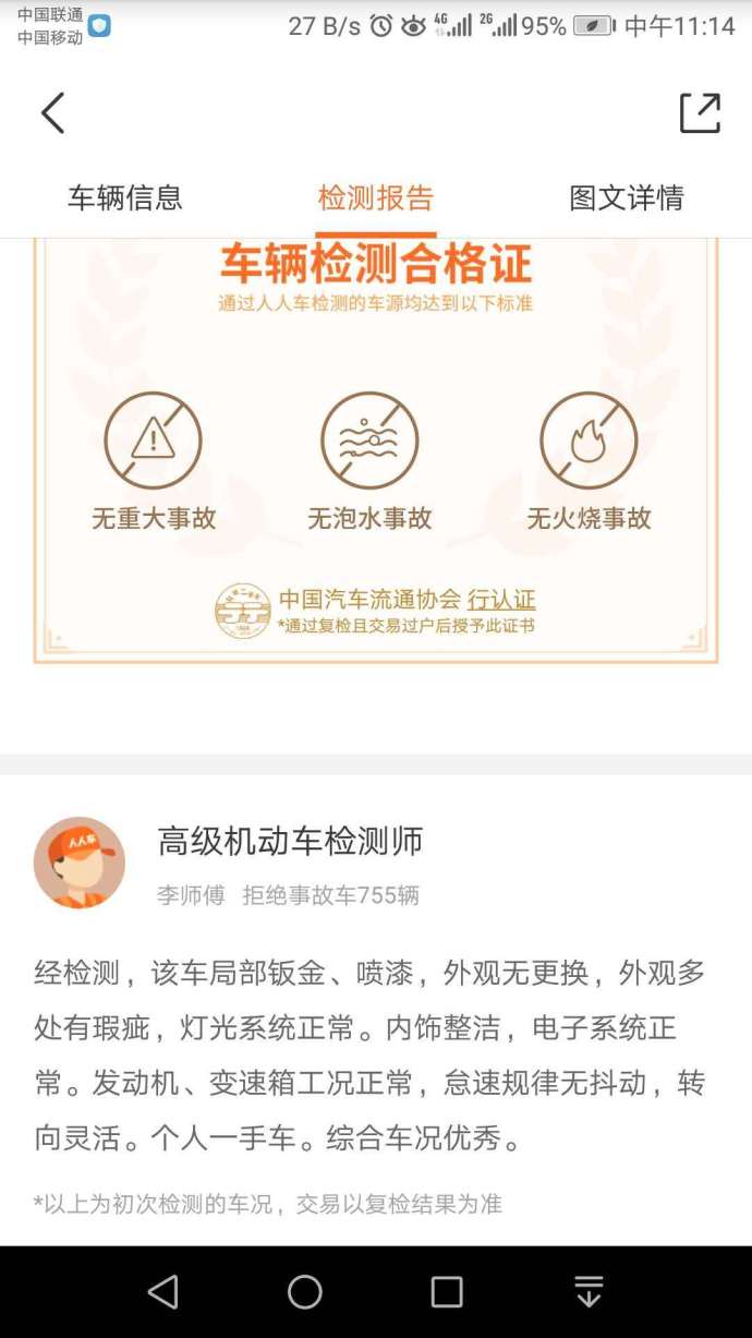 根據(jù)吳先生向《消費(fèi)者報道》提供的信息,這輛東南V5二手車在人人車平臺的車輛檢測報告顯示,車輛檢測合格證,通過人人車檢測的車源均達(dá)到以下標(biāo)準(zhǔn):無重大事故、無泡水事故、無火燒事故。
