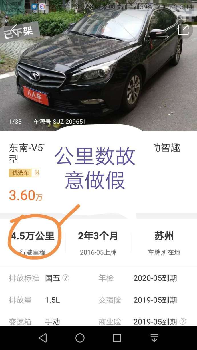 據(jù)吳先生介紹,不久前,他在二手車交易平臺人人車上看中一臺原蘇州牌照的東南-V5菱致 2015款 plus 1.5L 手動智趣型汽車,標(biāo)價3.6萬元,標(biāo)稱行駛里程4.5萬公里。