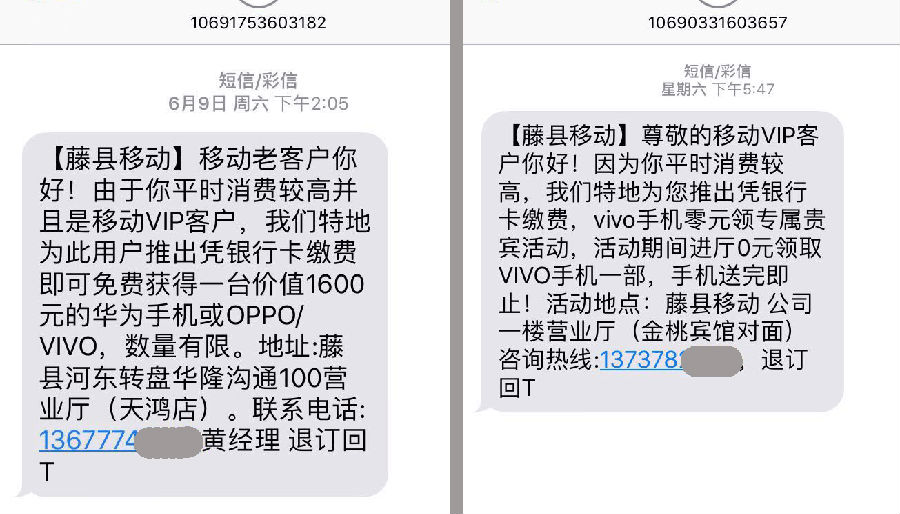 6月22日起,廣西梧州藤縣移動溝通100營業(yè)廳挑選手機的人多了起來,大部分顧客是被一則標(biāo)有當(dāng)?shù)貭I業(yè)廳地址的“免費送手機”短信吸引——活動期間進營業(yè)廳0元領(lǐng)取VIVO手機一部,送完即止。