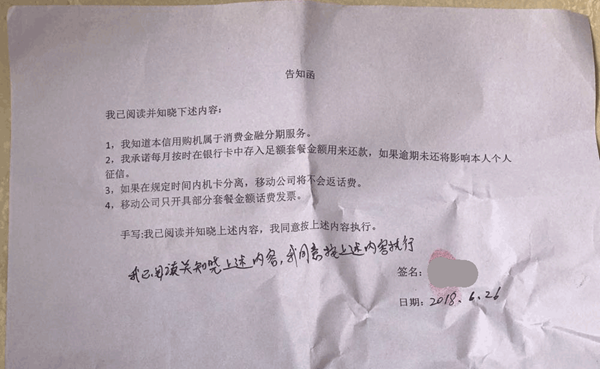 近日,本刊收到多名消費者投訴,2018年6月,廣西梧州藤縣移動溝通100營業(yè)廳以“免費送手機,0元購機”為名,變相銷售合約機,并在不充分告知的情況下為消費者辦理“中移金服(北京)科技有限公司”及“馬上消費金融股份有限公司”的信用購機(即手機貸款)業(yè)務(wù)。