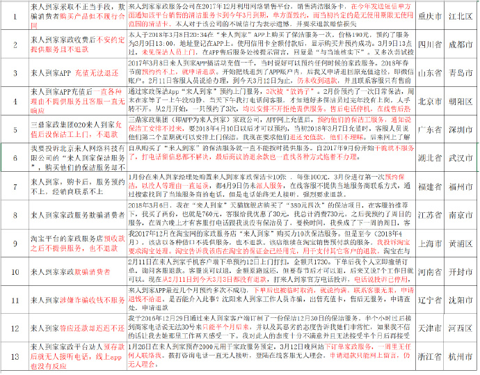 ?不同城市的消費者對三鼎家政、來人到家投訴截選