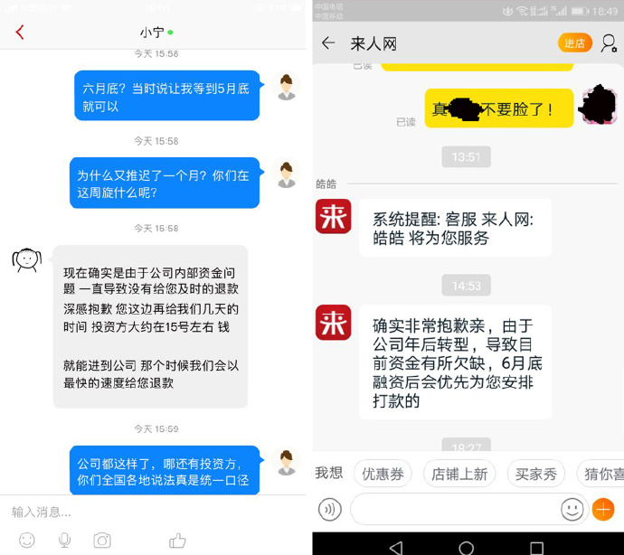 也有一部分在職員工,用資金鏈斷裂、自己的工資也未發(fā)作為推脫理由,試圖打“同情牌”來說服堅持要求服務(wù)或退款的用戶。
