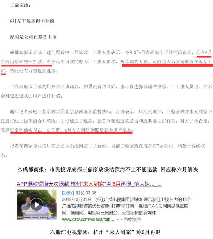 多家媒體報道三鼎家政承諾6月退款