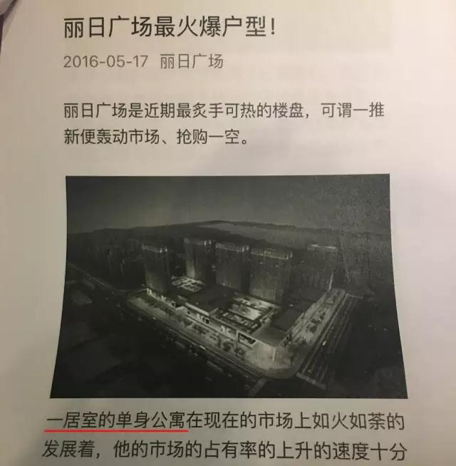 得知自己所買房子僅能用來辦公后,業(yè)主們開始收集開發(fā)商先前對麗日廣場進(jìn)行的有關(guān)“公寓”的宣傳。麗日廣場的官方微信“麗日廣場”在2016年5月17日發(fā)布的一篇名為“麗日廣場最火爆戶型!”的文章中,明確說明廣場內(nèi)所售房產(chǎn)為“單身公寓”。