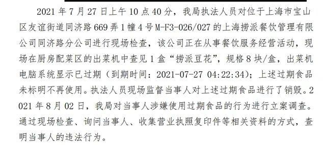 處罰文書顯示,上海市寶山區(qū)市場監(jiān)督管理局執(zhí)法人員對位于上海市寶山區(qū)友誼街道同濟(jì)路669弄1幢4號M-F3-026/027的上海撈派餐飲管理有限公司同濟(jì)路分公司進(jìn)行現(xiàn)場檢查,該公司正在從事餐飲服務(wù)經(jīng)營活動,現(xiàn)場在廚房配菜區(qū)的出菜機(jī)中查見1盒“撈派豆花”,規(guī)格8塊/盒,出菜機(jī)電腦系統(tǒng)顯示已過期;上述過期食品未標(biāo)明不再使用。