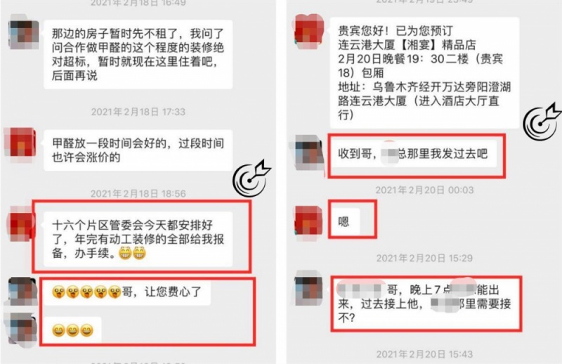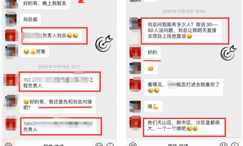在一張聊天截圖中,在一個(gè)四人群內(nèi),一人將烏魯木齊當(dāng)?shù)氐拇笮偷禺a(chǎn)項(xiàng)目的負(fù)責(zé)人電話發(fā)到群里,并留言稱:“能否打進(jìn)去就靠你了”“他們?cè)赬X區(qū)和XX區(qū)的盤都很大,一個(gè)一個(gè)啃吧。”蔣某透露,發(fā)這些信息的就是馬某。蔣女士稱,這完全就是利用職務(wù)之便為他人謀取利益。