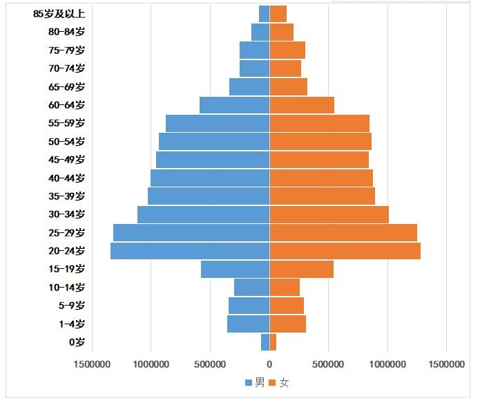 年齡構(gòu)成:全市常住人口中,0-14歲人口為2436296人,占9.8%;15-59歲人口為16619137人,占66.8%;60歲及以上人口為5815462人,占23.4%,其中65歲及以上人口為4049012人,占16.3%。