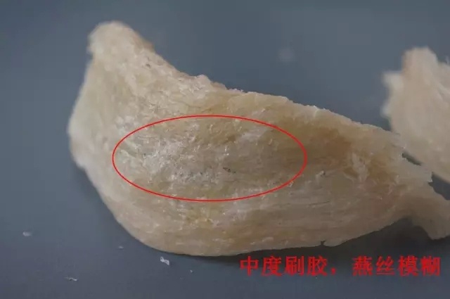 燕窩刷膠的主要目的一是增加重量,二是為了美觀。木薯粉、食用膠、所謂的燕漿都是刷的材料,還有一種噴鎖水劑的,讓水分無法從燕窩中出來,其成份類似于頭發(fā)用的摩絲,噴上去后讓燕窩有剌手感,感覺上很干,其實(shí)水份都鎖在燕窩里面了。