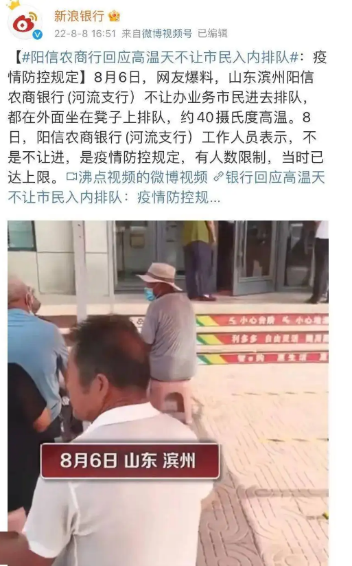 8月6日,網(wǎng)友爆料,山東濱州陽(yáng)信農(nóng)商銀行(河流支行)不讓辦理業(yè)務(wù)市民進(jìn)去排隊(duì),都在外面坐在凳子上排隊(duì),當(dāng)時(shí)室外約40攝氏度高溫。
