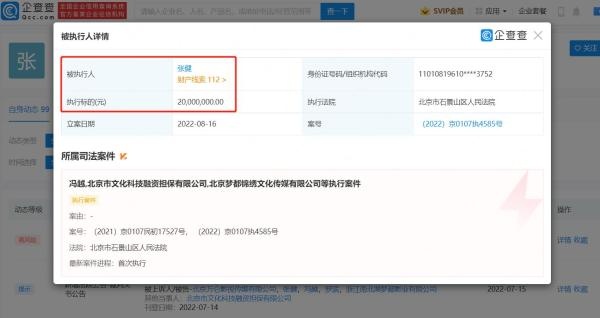 企查查APP顯示,近日,張若昀父親張健新增被執(zhí)行人信息,執(zhí)行標(biāo)的2000萬(wàn)元,案號(hào)(2022)京0107執(zhí)4585號(hào),執(zhí)行法院為北京市石景山區(qū)人民法院,立案時(shí)間為8月16日。企查查信息顯示,張健共關(guān)聯(lián)11家企業(yè),擔(dān)任9家企業(yè)法定代表人職務(wù),其中4家已注銷(xiāo)