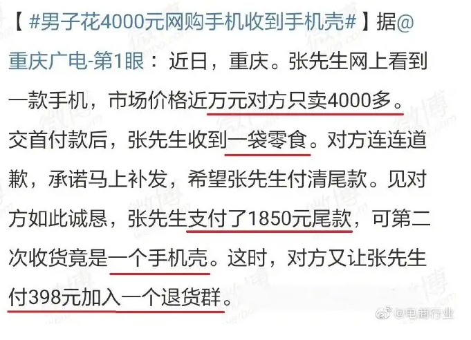 近萬(wàn)元的手機(jī)只要4000元.還可以先付一部分手機(jī)到了再付后款.聽(tīng)起來(lái)是不是很可靠.付了2000元收到一堆零食.付了后款收到一個(gè)手機(jī)殼.然后又花了四百進(jìn)一個(gè)退貨群.這個(gè)坑