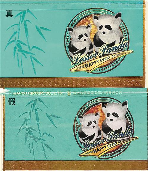 正面文字差異對(duì)比:真煙“小熊貓”字樣字體較粗,字形渾厚有力,凸起明顯,燙金緊湊均勻;假煙“小熊貓”字樣字體較細(xì),似連似斷,凸起不明顯,邊緣燙金較寬。
