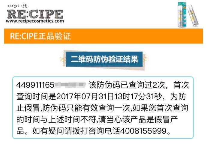 網(wǎng)紅防曬產(chǎn)品RE:CIPE的二維碼還能夠記錄查詢時間,如果在你之前有人掃描過該二維碼,那就要小心有遇到假貨的可能。掃描二維碼來驗偽還是十分便捷安全的,結(jié)果可信賴。
