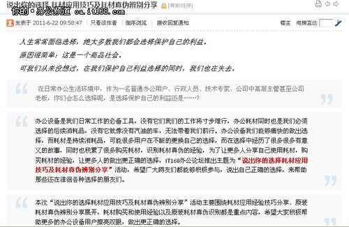 近期IT168辦公論推出了主題為:“說出你的選擇耗材應(yīng)用技巧及耗材真?zhèn)伪鎰e分享”活動,活動期間很多網(wǎng)友都參與本次話題討論,而且很多網(wǎng)友都分享和參與了經(jīng)驗(yàn)分享討論,我們匯總收集了很多經(jīng)典的經(jīng)驗(yàn),希望對大家識別真假耗材、耗材日常應(yīng)用有指導(dǎo)幫助作用。