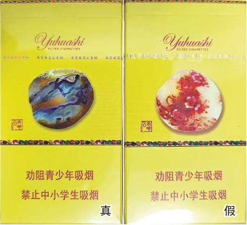 小盒背面圖案差異對比:真煙雨花石圖案用手指摸上去凸起感強烈,石頭顆顆分明;假煙雨花石圖案用手指摸上去凸起感不強,無立體感。