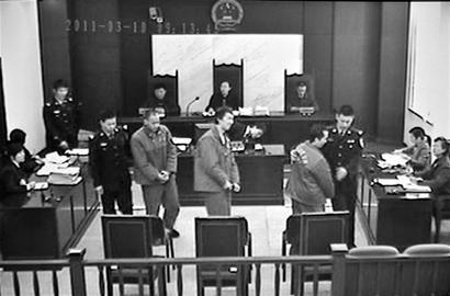 圖為:“成渝合佳散戶聯(lián)盟”詐騙案幾名被告人在北京懷柔法院受審(3月17日攝)