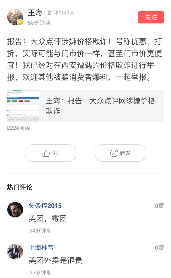 打假人王海舉報(bào)大眾點(diǎn)評(píng)價(jià)格欺詐