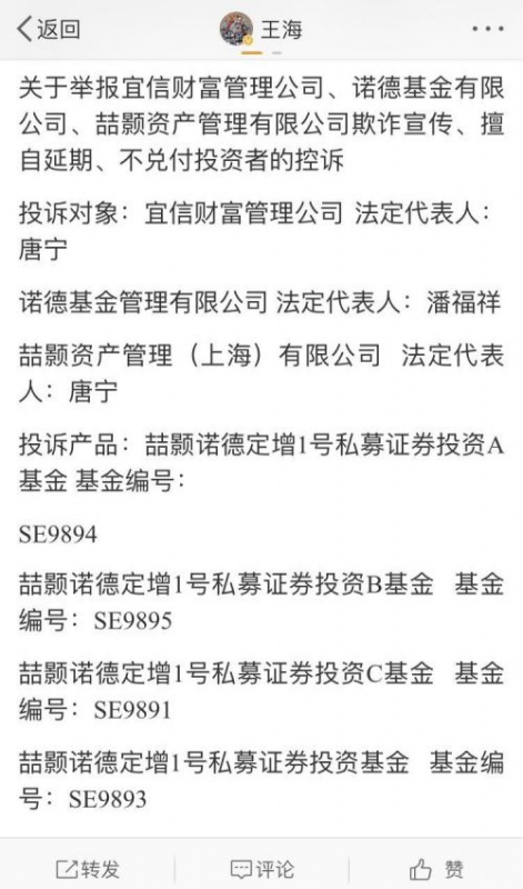 微博內容顯示,王海發(fā)布的“報告”實為投資人瞿錁的實名舉報信,被舉報的三家企業(yè)分別為宜信財富管理公司、諾德基金管理有限公司、喆顥資產管理(上海)有限公司。其中,宜信財富、喆顥資產兩家企業(yè)的法定代表人均為唐寧,諾德基金的法定代表人為潘福祥。被舉報的產品為喆顥諾德定增1號私募證券投資A基金(基金編號:SE9894)、 喆顥諾德定增1號私募證券投資B基金(基金編號:SE9895)、喆顥諾德定增1號私募證券投資C基金(基金編號:SE9891)、喆顥諾德定增1號私募證券投資基金(基金編號:SE9893)。