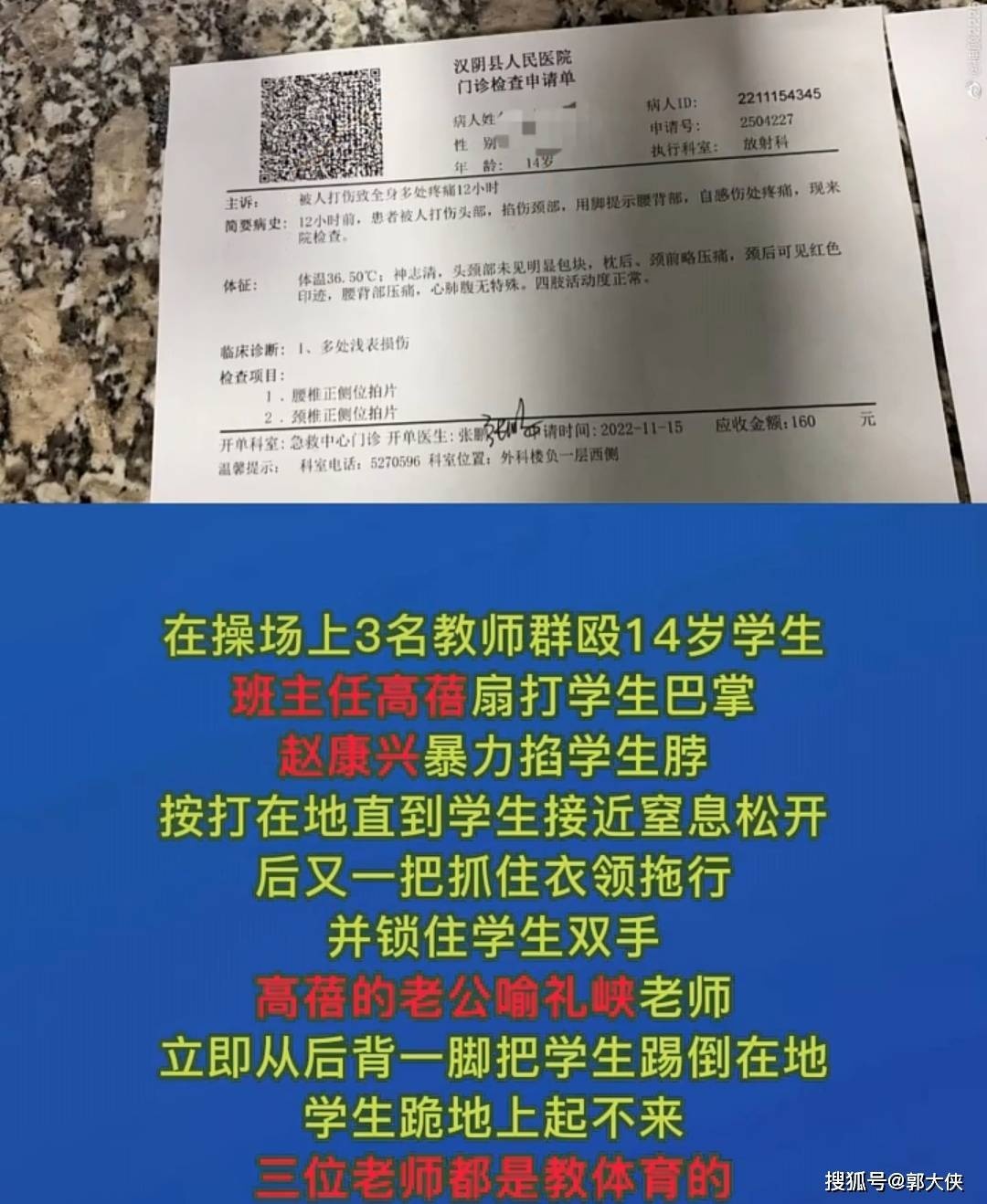 在操場上3名教師群毆14歲學(xué)生,班主任高蓓扇打?qū)W生巴掌,趙康興暴力掐學(xué)生脖子,按打在地直到學(xué)生接近室息松開后又一把抓住衣領(lǐng)拖行并鎖住學(xué)生雙手,高蓓的老公喻禮峽老師立即從后背一腳把學(xué)生踢倒在地,學(xué)生跪地上起不來,三位老師都是教體育的。