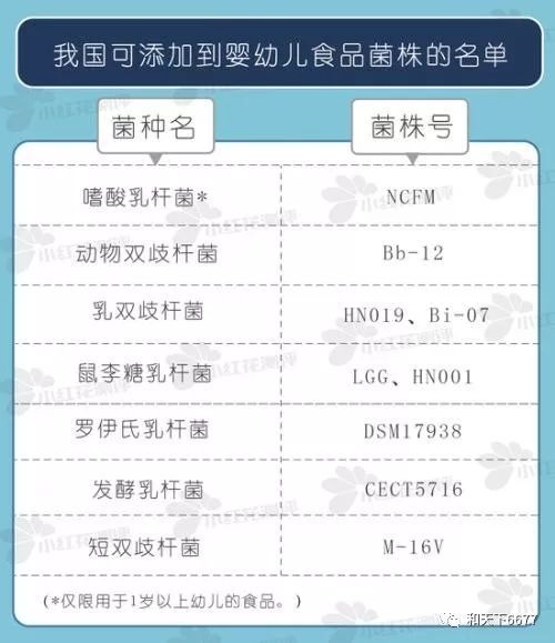 益生菌包含不同菌種,每個(gè)菌種下面又有不同菌株。根據(jù)國家衛(wèi)生計(jì)生委發(fā)布的《可用于嬰幼兒食品的菌種名單》,要求添加的益生菌要精準(zhǔn)到菌株而不是菌種。經(jīng)過安全性評估,只有以下菌株才可以添加到嬰幼兒食品當(dāng)中。