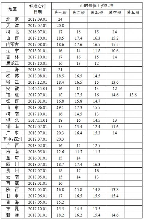 在小時最低工資標(biāo)準(zhǔn)方面,北京、上海、天津、廣東的小時最低工資標(biāo)準(zhǔn)超過20元大關(guān)。